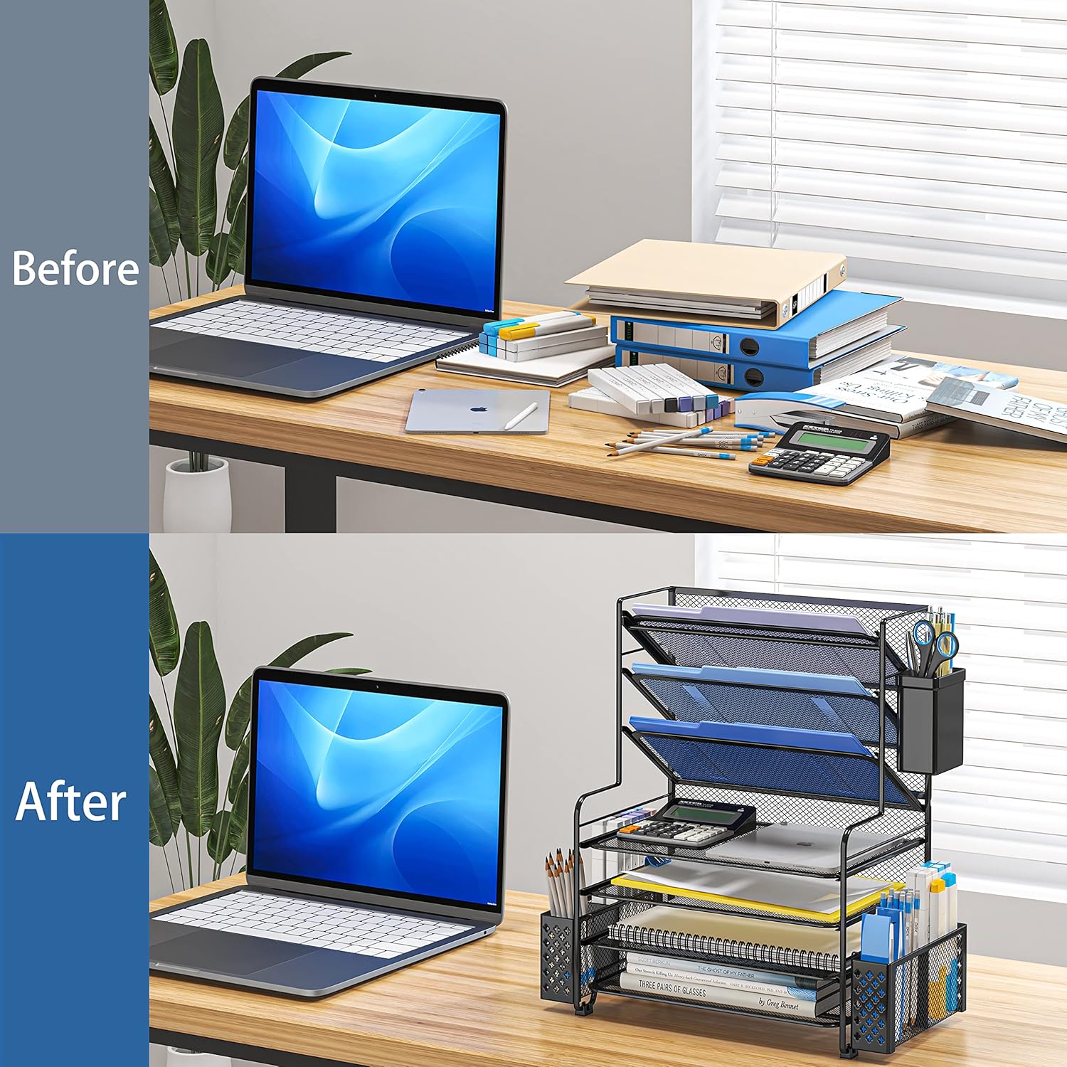 Keep your workspace organized and clutter-free with the Simple Trending 7 Tier Desk File Organizer. This sleek and modern organizer features seven trays to hold letters, papers, and documents, as well as a convenient pen holder and metal hanging basket for additional storage options. The black finish adds a touch of sophistication to any desk or office space, while the durable construction ensures long-lasting use. Say goodbye to messy piles of papers and hello to a tidy and efficient workspace with the Simple Trending 7 Tier Desk File Organizer.